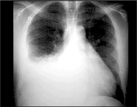 with a concave upper border that obscures the diaphragm, heart border and half of the lung field on the right side. The left side shows no evidence of effusion. Note the straightening of the