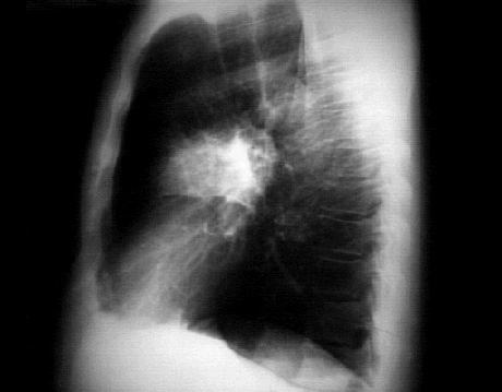radiodensity or infiltrate is superimposed on the hilar area and can be localized to the anterior segment of the right upper lobe.