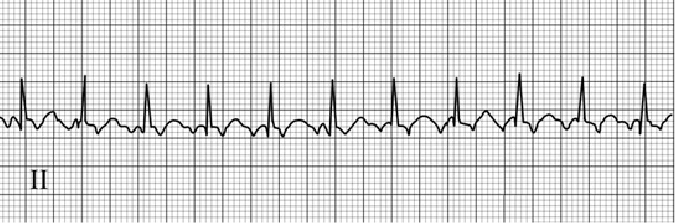 This rhythm strip shows atrial flutter. The characteristic features demonstrated here include a