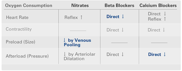 mechanism of action of nitrates, beta blockers and calcium channel blockers in the treatment of angina pectoris. Note their