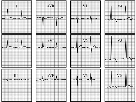 This electrocardiogram was taken one week after the initial tracing. It demonstrates evolving pericarditis.
