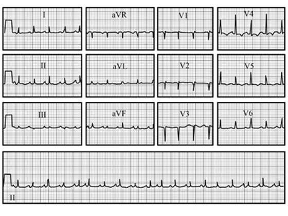 This is an electrocardiogram from a patient with a large pericardial effusion.