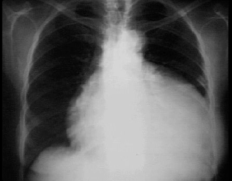This PA view shows a markedly enlarged cardiac silhouette producing a