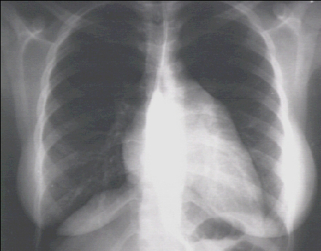 This PA view demonstrates the enlarged left ventricle as an increase in the inferolateral cardiac border associated with an increased cardiothoracic ratio . The markedly enlarged left atrium is manifested by the double contour within the heart border, an elevated left mainstem bronchus and an enlarged , left atrial appendage.