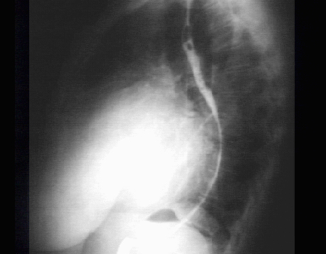 The lateral view with barium swallow, demonstrates marked posterior displacement of the esophagus by the giant left atrium.