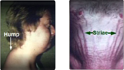 This lateral view from a different patient with Cushing's syndrome (image on the left) clearly shows an additional feature of the general appearance, the buffalo hump. The frontal view (image on the right) of still another patient demonstrates chest and abdominal striae, another typical finding seen in patients with Cushing's syndrome.