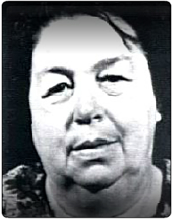 This is a photograph of a patient with myxedema due to hypothyroidism. The face appears swollen with periorbital puffiness. The lateral third of the eyebrows is characteristically thin. The skin is often pale and the hair is typically brittle, coarse and dry. Alopecia is also common.