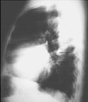The lateral view shows left ventricular enlargement, as evidenced by posterior displacement of the left ventricular shadow.