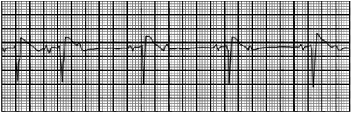 This rhythm strip shows sinus rhythm with blocked premature atrial complexes. The characteristic feature demonstrated here include