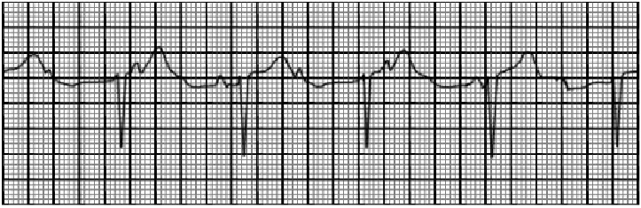 This rhythm strip shows complete heart block. The characteristic features demonstrated here include P waves that occur at regular intervals and QRS complexes that also occur at regular but usually slower intervals. The PR interval is not constant. There is no relationship between the Ps and the QRSs. In this case, the QRS complexes are narrow and originate from the junctional area. In some cases, the QRS complexes may be wide and slower due to an intrinsic ventricular focus.