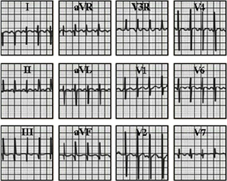 dominant R waves in leads V3R and V1, along with