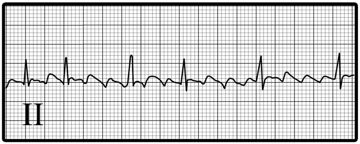 This rhythm strip shows atrial flutter. The characteristic features demonstrated here include: