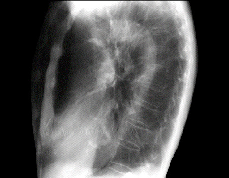 calcified mitral valve annulus. The “J” shaped density is well seen here, as it does not overlap bony structures.