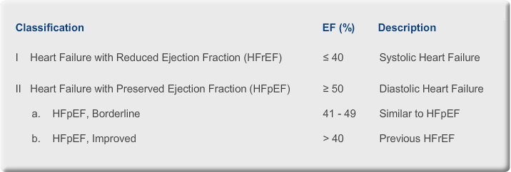 Current heart failure classification definitions use the term heart failure with reduced ejection fraction or heart failure with preserved ejection fraction. Heart failure with reduced ejection fraction equal to or less than 40% is known as HFrEF and refers to systolic heart failure. Heart failure with preserved ejection fraction equal to or greater than fifty percent is known as HFpEF and refers to diastolic heart failure. One subset of HFpEF is borderline HFpEF with an ejection fraction of forty-one to forty-nine percent. These patients usually present with similar characteristics, treatment patterns and outcomes as patients with HFpEF. Another subset of HRpEF is improved HRpEF. These are patients with heart failure with reduced ejection fraction that now have improved ejection fraction.