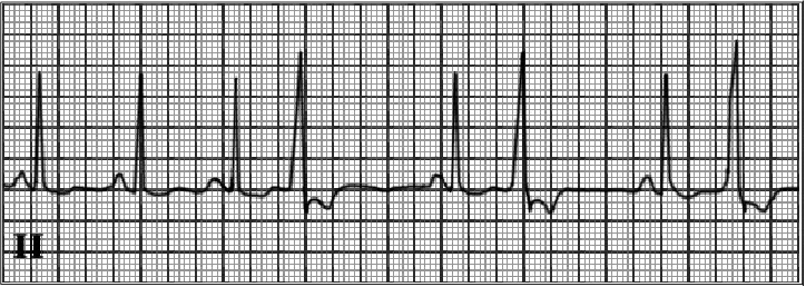 This rhythm strip shows sinus rhythm with premature ventricular complexes. The underlying sinus rhythm is reflected by normal