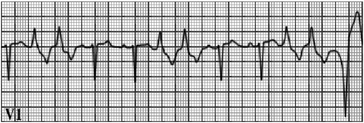 sinus QRS at a rate of 95 beats per minute. The first two sets of early or premature ventricular complexes occur in