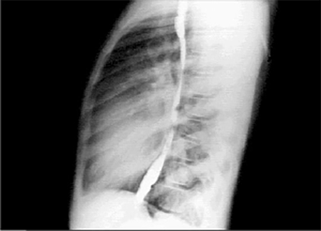 In the lateral view with barium swallow, right ventricular enlargement is manifested by