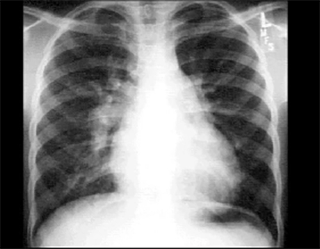 obliteration of the retrosternal air space. The pulmonary arteries are large.