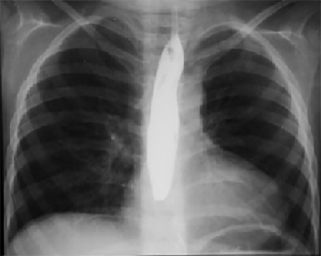 This chest X ray taken during a barium swallow shows right ventricular enlargement, a small pulmonary trunk, increased pulmonary arterial vascularity and a left aortic arch.
