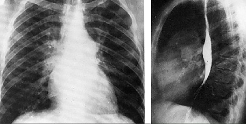 These chest X rays taken during a barium swallow show right ventricular enlargement, a large pulmonary trunk, pulmonary venous congestion and a left aortic arch.