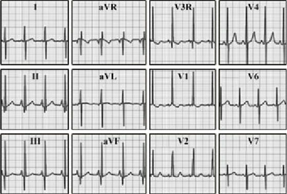 This electrocardiogram in a one-year-old infant demonstrates right ventricular hypertrophy and right atrial enlargement.